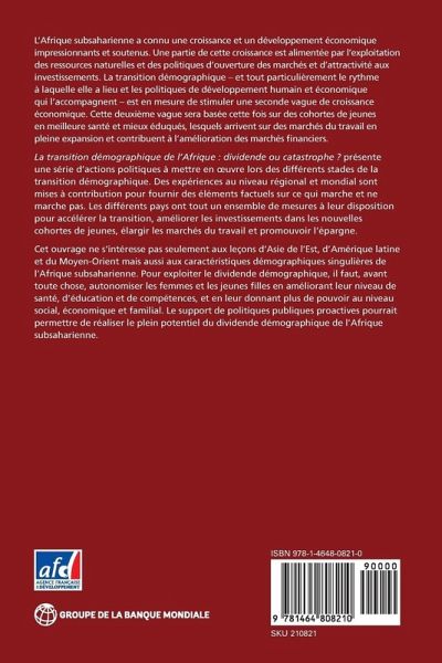 Résumé : L'Afrique est sur le bord d'un lancement potentiel de croissance économique soutenue. Cette ascension peut être accélérée par un dividende démographique dû aux changements dans la structure par âge de la population. Les baisses de la mortalité infantile, suivies par la baisse de la fécondité, produisent une génération.