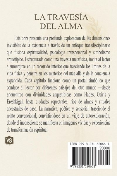 La Travesía del Alma - Crónicas del Más Allá Esta obra presenta una profunda exploración de las dimensiones invisibles de la existencia a través de un enfoque transdisciplinario que fusiona espiritualidad, psicología transpersonal y simbolismo arquetípico. Estructurada como una travesía metafísica, invita al lector a sumergirse en un recorrido interior que trasciende los límites de la vida física y penetra en los misterios del más allá y de la conciencia expandida. Cada capítulo funciona como un portal simbólico que conduce al lector por diferentes paisajes del otro mundo -desde encuentros con divinidades arquetípicas como Hades, Osiris y Ereshkigal, hasta ciudades espectrales, ríos de almas y rituales ancestrales de paso. La narrativa, poética y sensorial, trasciende el relato convencional, convirtiéndose en un viaje de autoexploración, donde el inconsciente se manifiesta en imágenes vívidas y experiencias de transformación espiritual. La obra se apoya en prácticas de sabiduría ancestral y en elementos de la naturaleza -como cristales, plantas y espejos- para ilustrar las múltiples formas de conexión entre el plano terrenal y los reinos sutiles. No se trata solo de una lectura sobre la muerte, sino sobre renacimiento, integración y eternidad.