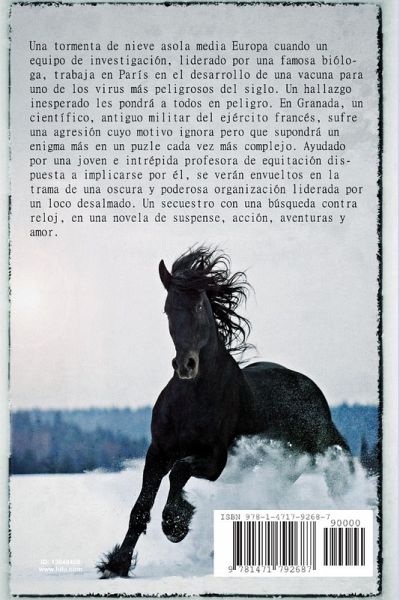 Una tormenta de nieve asola media Europa cuando un equipo de investigación, liderado por una famosa bióloga, trabaja en París en el desarrollo de una vacuna para uno de los virus más peligrosos del siglo. Un hallazgo inesperado les pondrá a todos en peligro. En Granada, un científico, antiguo militar del ejercito francés, sufre una agresión cuyo motivo ignora pero que supondrá un enigma más en un puzle cada vez más complejo. Ayudado por una joven e intrépida profesora de equitación dispuesta a implicarse por él, se verán envueltos en la trama de una oscura y poderosa organización liderada por un loco desalmado. Un secuestro con una búsqueda contra reloj, en una novela de suspense, acción, aventuras y amor.