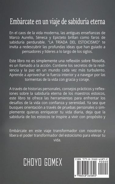 Embárcate en un viaje de sabiduría eterna En el caos de la vida moderna, las antiguas enseñanzas de Marco Aurelio, Séneca y Epicteto brillan como faros de sabiduría perdurable. "LA TRÍADA DEL ESTOICISMO" te invita a redescubrir las profundas ideas que han guiado a pensadores y líderes a lo largo de los siglos. Este libro no es simplemente una reflexión sobre filosofía, es un llamado a la acción. Contiene los secretos de la resil- iencia y la paz en un mundo cada vez más turbulento. Aprende a aprovechar la fuerza interior y a navegar por las tormentas de la vida con gracia y coraje. A través de historias personales, consejos prácticos y reflex- iones sobre la sabiduría eterna de los maestros estoicos, este libro te ofrece las herramientas para enfrentar los desafíos de la vida con confianza y serenidad. Ya sea que busques orientación a través de pruebas personales o sim- plemente quieras enriquecer tu vida diaria, deja que la sabiduría de los estoicos te inspire a vivir con propósito y Embárcate en este viaje transformador con nosotros y libera el poder transformador del estoicismo para elevar tu vida.