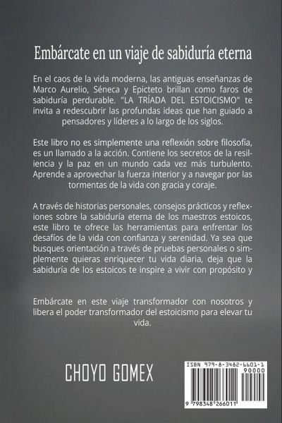 Embárcate en un viaje de sabiduría eterna En el caos de la vida moderna, las antiguas enseñanzas de Marco Aurelio, Séneca y Epicteto brillan como faros de sabiduría perdurable. "LA TRÍADA DEL ESTOICISMO" te invita a redescubrir las profundas ideas que han guiado a pensadores y líderes a lo largo de los siglos. Este libro no es simplemente una reflexión sobre filosofía, es un llamado a la acción. Contiene los secretos de la resil- iencia y la paz en un mundo cada vez más turbulento. Aprende a aprovechar la fuerza interior y a navegar por las tormentas de la vida con gracia y coraje. A través de historias personales, consejos prácticos y reflex- iones sobre la sabiduría eterna de los maestros estoicos, este libro te ofrece las herramientas para enfrentar los desafíos de la vida con confianza y serenidad. Ya sea que busques orientación a través de pruebas personales o sim- plemente quieras enriquecer tu vida diaria, deja que la sabiduría de los estoicos te inspire a vivir con propósito y Embárcate en este viaje transformador con nosotros y libera el poder transformador del estoicismo para elevar tu vida.