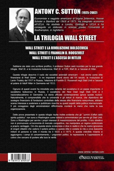 Sebbene sia stato uno scrittore prolifico, il professor Sutton sarà ricordato per la sua grande trilogia: Wall St. e la rivoluzione bolscevica , Wall St. e FDR, Wall St. e l'ascesa di Hitler.Questa trilogia descrive il ruolo dei socialisti aziendali americani - noti anche come élite finanziaria di Wall Street - in tre importanti eventi storici del XX secolo: la rivoluzione di Lenin-Trotsky del 1917 in Russia, l'elezione di Franklin D. Roosevelt negli Stati Uniti e l'ascesa al potere di Adolf Hitler in Germania nel 1933. Ognuno di questi eventi ha introdotto una variante del socialismo in un paese importante: il socialismo bolscevico in Russia, il socialismo del New Deal negli Stati Uniti e il nazionalsocialismo in Germania. La storia ufficiale contemporanea ignora queste nozioni. Naturalmente, è comprensibile che le università e gli istituti di ricerca, che dipendono dal sostegno finanziario di fondazioni controllate dalla stessa élite finanziaria newyorkese, abbiano scarso interesse a sostenere e pubblicare ricerche su questi aspetti della politica internazionale. Il più coraggioso degli amministratori difficilmente morderà la mano che nutre la sua organizzazione. Dalle prove presentate in questa trilogia risulta inoltre evidente che gli "uomini d'affari dallo spirito pubblico" non sono a Washington come lobbisti e amministratori per servire gli Stati Uniti. Sono a Washington per servire i propri interessi di massimizzazione del profitto. Il loro obiettivo non è promuovere un'economia di mercato competitiva, ma manipolare un regime politicizzato a proprio vantaggio. Ciò che questa storia revisionista ci dice in realtà è che la nostra ignoranza di singoli cittadini che cedono il potere politico a questa élite è costata la vita a circa duecento milioni di persone in tutto il mondo tra il 1820 e il 1975. A questa indicibile miseria si aggiungono i campi di concentramento, i prigionieri politici, la repressione e l'oppressione di coloro che cercano di portare alla luce la verità.