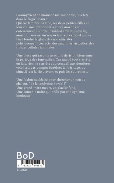 Granny vient de mourir dans son home, "La tête dans le frigo". Bam !Quatre femmes, sa fille, ses deux petites-filles et leur cousine reforment à l'occasion de cet enterrement un noyau familial ardent, sauvage, aimant, haineux, un noyau humain explosif qui va faire fondre la glace des non-dits, des politiquement corrects, des machines virtuelles, des froides cellules familiales. Une pièce qui raconte avec une dérision bienvenue la période des funérailles. Car quand tout s'arrête, en fait, rien ne s'arrête : du cercueil aux dernières volontés, des pompes funèbres à l'héritage, du cimetière à la vie d'avant, et puis les souvenirs...Une fusion nucléaire pour chercher un peu de chaleur, "de la tendresse bordel !"Une grand-mère meurt, un glacier fond.Une comédie noire qui brille par son cynisme lumineux.