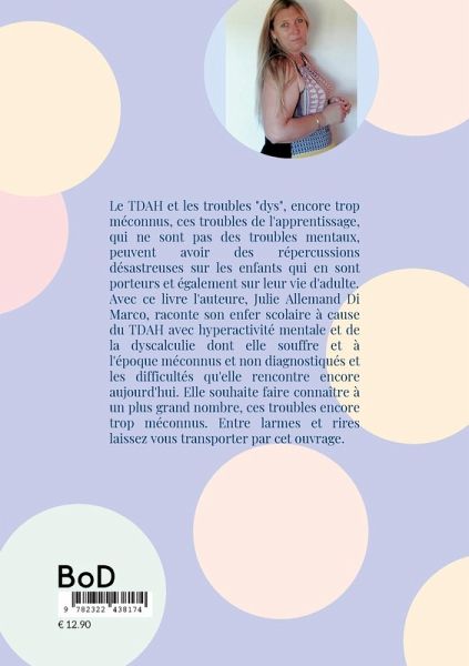 Le TDAH et les troubles "dys", encore trop méconnus, ces troubles de l'apprentissage, qui ne sont pas des troubles mentaux, peuvent avoir des répercussions désastreuses sur les enfants qui en sont porteurs et également sur leur vie d'adulte.Avec ce livre l'auteure, Julie Allemand Di Marco, raconte son enfer scolaire à cause du TDAH avec hyperactivité mentale et de la dyscalculie dont elle souffre et à l'époque méconnus et non diagnostiqués et les difficultés qu'elle rencontre encore aujourd'hui. Elle souhaite faire connaître à un plus grand nombre, ces troubles encore trop méconnus. Entre larmes et rires laissez vous transporter par cet ouvrage.