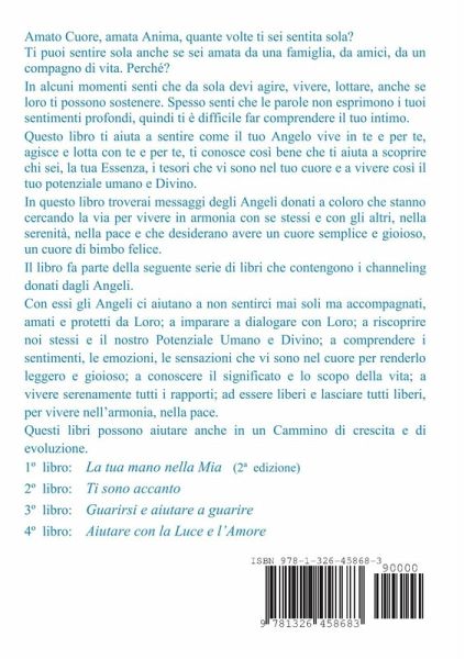 Amato Cuore, amata Anima, quante volte ti sei sentita sola? Ti puoi sentire sola anche se sei amata da una famiglia, da amici, da un compagno di vita. Perché? In alcuni momenti senti che da sola devi agire, vivere, lottare. Questo libro ti aiuta a sentire come il tuo Angelo vive in te e per te, agisce e lotta con te e per te, ti conosce così bene che ti aiuta a scoprire chi sei, la tua Essenza, i tesori che vi sono nel tuo cuore e a vivere così il tuo potenziale umano e Divino. Il libro fa parte della seguente serie di libri che contengono i channeling donati dagli Angeli. Con questi messaggi gli Angeli ci aiutano a percorrere la Via per vivere in armonia con se stessi e con gli altri, nella serenità, nella pace, ad avere un cuore semplice, un cuore di bimbo felice. Questi libri possono aiutare anche in un Cammino di crescita e di evoluzione. 1º libro: La tua mano nella Mia (2ª edizione) 2º libro: Ti sono accanto 3º libro: Guarirsi e aiutare a guarire 4º libro: Aiutare con la Luce e l'Amore