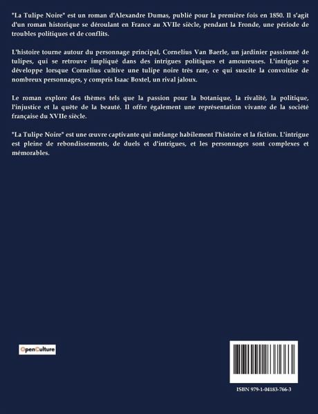 "La Tulipe Noire" est un roman d'Alexandre Dumas, publié pour la première fois en 1850. Il s'agit d'un roman historique se déroulant en France au XVIIe siècle, pendant la Fronde, une période de troubles politiques et de conflits. L'histoire tourne autour du personnage principal, Cornelius Van Baerle, un jardinier passionné de tulipes, qui se retrouve impliqué dans des intrigues politiques et amoureuses. L'intrigue se développe lorsque Cornelius cultive une tulipe noire très rare, ce qui suscite la convoitise de nombreux personnages, y compris Isaac Boxtel, un rival jaloux. Le roman explore des thèmes tels que la passion pour la botanique, la rivalité, la politique, l'injustice et la quête de la beauté. Il offre également une représentation vivante de la société française du XVIIe siècle. "La Tulipe Noire" est une ¿uvre captivante qui mélange habilement l'histoire et la fiction. L'intrigue est pleine de rebondissements, de duels et d'intrigues, et les personnages sont complexes et mémorables.