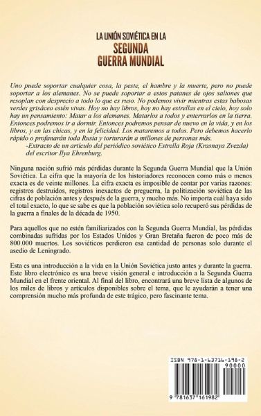 Si quiere aprender sobre la Unión Soviética y el frente oriental durante la Segunda Guerra Mundial, continúe leyendo... Ninguna nación sufrió más pérdidas durante la Segunda Guerra Mundial que la Unión Soviética. La cifra que la mayoría de los historiadores reconocen como exacta es de veinte millones. La cifra exacta es imposible de contar por varias razones: registros destruidos, registros inexactos de preguerra, politización soviética de las cifras de población antes y después de la guerra, y mucho más. No importa cuál haya sido el total exacto, lo que se sabe es que la población soviética solo recuperó sus pérdidas de la guerra a finales de la década de 1950. Para aquellos que no estén familiarizados con la Segunda Guerra Mundial, las pérdidas combinadas sufridas por los Estados Unidos y Gran Bretaña fueron de poco más de 800.000 muertos. Los soviéticos perdieron esa cantidad de personas solo durante el asedio de Leningrado. En La Unión Soviética en la Segunda Guerra Mundial: Una guía fascinante de la vida en la Unión Soviética y acontecimientos como la batalla de Stalingrado, la batalla de Kursk, y el asedio de Leningrado, usted descubrirá temas como:Antes de la guerra Estalinismo 1938 y 1939 Interludio Barbarroja Guerra de Exterminio Las grandes batallas ¡Y mucho, mucho más! ¡Obtenga este libro ahora para aprender más sobre la Unión Soviética en la Segunda Guerra Mundial!