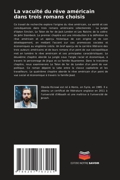 Ce travail de recherche explore l'origine du rêve américain, sa vanité et ses conséquences dans trois romans américains sélectionnés : La Jungle d'Upton Sinclair, Le Talon de fer de Jack London et Les Raisins de la colère de John Steinbeck. Le premier chapitre est une introduction à la définition du rêve américain et un aperçu historique de son origine et de son développement, en mettant l'accent sur ses promesses sociales et économiques au vingtième siècle. Un bref aperçu de la carrière littéraire des trois auteurs américains et de leurs romans d'un point de vue sociopolitique met en lumière le rêve américain et ses principales caractéristiques. Le deuxième chapitre aborde La jungle sous l'angle racial et économique, à travers le personnage de Jirgus et sa famille lituanienne. Dans le troisième chapitre, nous examinerons Le Talon de fer de London d'un point de vue politique. Ce roman dépeint la lutte entre la classe capitaliste et les travailleurs. Le quatrième chapitre aborde le rêve américain d'un point de vue social et économique à travers la famille Joad.