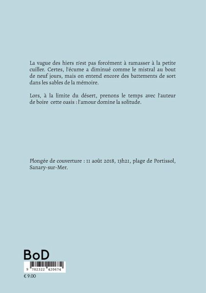 La vague des hiers n'est pas forcément à ramasser à la petite cuiller. Certes, l'écume a diminué comme le mistral au bout de neuf jours,mais on entend encore des battements de sort dans les sables de la mémoire. Lors, à la limite du désert, buvons avec l'auteur cette oasis : l'amour domine la solitude.