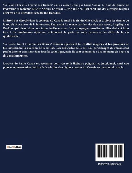 "La Vaine Foi et à Travers les Ronces" est un roman écrit par Laure Conan, le nom de plume de l'écrivaine canadienne Félicité Angers. Le roman a été publié en 1900 et est l'un des ouvrages les plus célèbres de la littérature canadienne-française. L'histoire se déroule dans le contexte du Canada rural à la fin du XIXe siècle et explore les thèmes de la foi, de la survie et de la lutte contre l'adversité. Le roman suit les vies de deux s¿urs, Angélique et Pauline, qui vivent dans une ferme isolée au c¿ur de la campagne canadienne. Elles doivent faire face à de nombreuses épreuves, notamment la perte de leurs parents et les défis de la vie quotidienne. "La Vaine Foi et à Travers les Ronces" examine également les conflits religieux et les questions de foi, notamment la question de la foi face aux difficultés de la vie. Les personnages du roman sont profondément enracinés dans leur foi catholique, mais ils sont confrontés à des moments de doute et de questionnement. L'¿uvre de Laure Conan est reconnue pour son style littéraire poignant et émotionnel, ainsi que pour sa représentation réaliste de la vie dans les régions rurales du Canada au tournant du siècle.