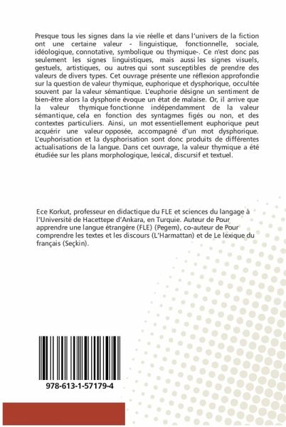 Presque tous les signes dans la vie réelle et dans l'univers de la fiction ont une certaine valeur - linguistique, fonctionnelle, sociale, idéologique, connotative, symbolique ou thymique-. Ce n'est donc pas seulement les signes linguistiques, mais aussi les signes visuels, gestuels, artistiques, ou autres qui sont susceptibles de prendre des valeurs de divers types. Cet ouvrage présente une réflexion approfondie sur la question de valeur thymique, euphorique et dysphorique, occultée souvent par la valeur sémantique. L'euphorie désigne un sentiment de bien-être alors la dysphorie évoque un état de malaise. Or, il arrive que la valeur thymique fonctionne indépendamment de la valeur sémantique, cela en fonction des syntagmes figés ou non, et des contextes particuliers. Ainsi, un mot essentiellement euphorique peut acquérir une valeur opposée, accompagné d'un mot dysphorique. L'euphorisation et la dysphorisation sont donc produits de différentes actualisations de la langue. Dans cet ouvrage, la valeur thymique a été étudiée sur les plans morphologique, lexical, discursif et textuel.