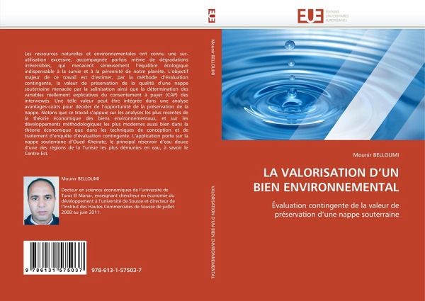 Les ressources naturelles et environnementales ont connu une sur-utilisation excessive, accompagnée parfois même de dégradations irréversibles, qui menacent sérieusement l'équilibre écologique indispensable à la survie et à la pérennité de notre planète. L'objectif majeur de ce travail est d'estimer, par la méthode d'évaluation contingente, la valeur de préservation de la qualité d'une nappe souterraine menacée par la salinisation ainsi que la détermination des variables réellement explicatives du consentement à payer (CAP) des interviewés. Une telle valeur peut être intégrée dans une analyse avantages-coûts pour décider de l'opportunité de la préservation de la nappe. Notons que ce travail s'appuie sur les analyses les plus récentes de la théorie économique des biens environnementaux, et sur les développements méthodologiques les plus modernes aussi bien dans la théorie économique que dans les techniques de conception et de traitement d'enquête d'évaluation contingente. L'application porte sur la nappe souterraine d'Oued Kheirate, le principal réservoir d'eau douce d'une des régions de la Tunisie les plus démunies en eau, à savoir le Centre-Est.