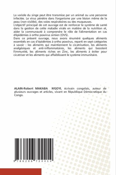 La variole du singe peut être transmise par un animal ou une personne infectée. Le virus pénètre dans l'organisme par une lésion même de la peau (non visible), des voies respiratoires ou des muqueuses.L'objectif principal de cet ouvrage est de renforcer le système de santé dans la gestion de cette maladie virale en matière de la nutrition et, aider la communauté à comprendre le rôle de l'alimentation en cas d'épidémies à ortho poxvirus simien (OVS).Dans ce présent ouvrage, nous avons énuméré quelques aliments essentiels en cas d'épidémies à ortho poxvirus, reparti en sept catégories à savoir : les aliments qui maintiennent la cicatrisation, les aliments analgésiques et anti-inflammatoires, les aliments qui boostent l'immunité, les aliments riches en Zinc, les aliments à éviter pour cicatriser et les aliments qui affaiblissent le système immunitaire.