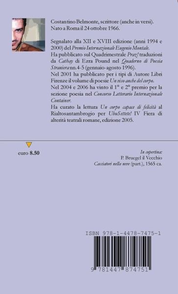 Costantino Belmonte, scrittore (anche in versi). Nato a Roma il 24 ottobre 1966. Nel novembre 2004 è uno dei poeti partecipanti al Progetto Klandestini - Letteratura emergente del Mediterraneo, col sostegno del British Council e di Inizjamed di Malta. Il 18 novembre 2005 ha curato come autore e regista la lettura *Un corpo capace di felicità* al Rialtosantambrogio per UbuSettete! - Fiera di alterità teatrali romane, IV edizione. Redattore per la sezione *letteratura* della webzine trimestrale Amnesia Vivace (ora offline). Segnalato alla XII e XVIII edizione (anni 1994 e 2000) del *Premio Internazionale Eugenio Montale*. Ha pubblicato sul Quadrimestrale *Praz!* traduzioni da *Cathay* di Ezra Pound nel *Quaderno di Poesia Straniera* nn. 4-5 (gennaio-agosto 1996). Nel 2001 ha pubblicato per i tipi di Autore Libri Firenze il volume di poesie *Un viso anche del corpo*. Nel 2004 e 2006 ha vinto il 1° e 2° premio per la sezione poesia nel *Concorso Letterario Internazionale Container*. Nel giugno 2014 è vincitore del *Premio dei Premi di Poesia* indetto e organizzato dalla libreria *Mangiaparole* di Roma (EPC, *Edizioni Progetto Cultura*) Con il volume di versi *Su un pianeta* è vincitore del 5° Contest *ilmioesordio 2015* per la Poesia, indetto dal Gruppo Editoriale L'Espresso. *Su un pianeta* è stato pubblicato nel 2017 per i tipi di E.P.C. - Edizioni Progetto Cultura, a Roma. Nel 2018 ha pubblicato il volume di versi *Gli alberi, per esempio* per le Edizioni La Gru. Traduzioni in inglese di alcuni suoi brani sono apparse sul portale Parallel Texts, a cura di Matilda Colarossi.
