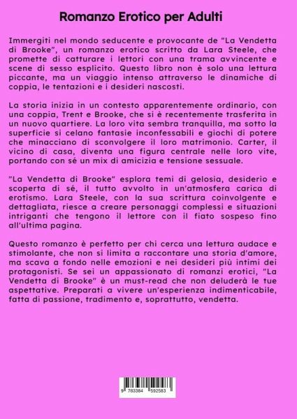 Immergiti nel mondo seducente e provocante de "La Vendetta di Brooke", un romanzo erotico scritto da Lara Steele, che promette di catturare i lettori con una trama avvincente e scene di sesso esplicito. Questo libro non è solo una lettura piccante, ma un viaggio intenso attraverso le dinamiche di coppia, le tentazioni e i desideri nascosti.La storia inizia in un contesto apparentemente ordinario, con una coppia, Trent e Brooke, che si è recentemente trasferita in un nuovo quartiere. La loro vita sembra tranquilla, ma sotto la superficie si celano fantasie inconfessabili e giochi di potere che minacciano di sconvolgere il loro matrimonio. Carter, il vicino di casa, diventa una figura centrale nelle loro vite, portando con sé un mix di amicizia e tensione sessuale."La Vendetta di Brooke" esplora temi di gelosia, desiderio e scoperta di sé, il tutto avvolto in un'atmosfera carica di erotismo. Lara Steele, con la sua scrittura coinvolgente e dettagliata, riesce a creare personaggi complessi e situazioni intriganti che tengono il lettore con il fiato sospeso fino all'ultima pagina.Questo romanzo è perfetto per chi cerca una lettura audace e stimolante, che non si limita a raccontare una storia d'amore, ma scava a fondo nelle emozioni e nei desideri più intimi dei protagonisti. Se sei un appassionato di romanzi erotici, "La Vendetta di Brooke" è un must-read che non deluderà le tue aspettative. Preparati a vivere un'esperienza indimenticabile, fatta di passione, tradimento e, soprattutto, vendetta.