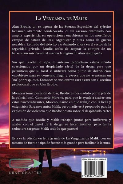 Alan Brodie, un ex agente de las Fuerzas Especiales del ejército británico altamente condecorado, es un asesino entrenado con amplia experiencia en operaciones encubiertas en los mortíferos campos de batalla de Irak, Afganistán y otras zonas de guerra negables. Retirado del ejército y trabajando ahora en el sector de la seguridad privada, Brodie acaba de aceptar la compra de un bar-restaurante frente al mar en la región de Almería, España. Sin que Brodie lo sepa, el anterior propietario estaba siendo coaccionado por un despiadado cártel de la droga para que permitiera que su local se utilizara como punto de distribución encubierto para su comercio ilegal y parece que no aceptarán un "no" por respuesta. Entonces se encuentran cara a cara con el asesino profesional que es Alan Brodie. Mientras toma posesión del bar, Brodie es persuadido por el jefe de la policía local, Comisario Moreno, para que le ayude a acabar con estos narcotraficantes, Moreno insiste en que trabaje con la bella y enigmática Sargento Anita Malik, pero nadie está preparado para la explosión de violencia que Brodie desata sobre el despiadado cártel. A medida que Brodie y Malik trabajan juntos para infiltrarse y acabar con el cártel de la droga, se hacen íntimos, pero ¿es la seductora sargento Malik todo lo que parece? Esta es la edición en letra grande de La Venganza de Malik, con un tamaño de fuente / tipo de fuente más grande para facilitar la lectura.