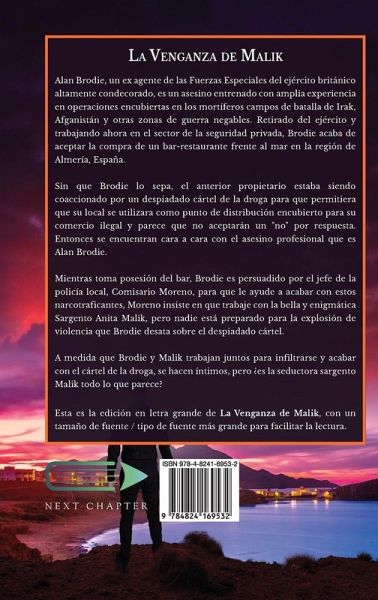Alan Brodie, un ex agente de las Fuerzas Especiales del ejército británico altamente condecorado, es un asesino entrenado con amplia experiencia en operaciones encubiertas en los mortíferos campos de batalla de Irak, Afganistán y otras zonas de guerra negables. Retirado del ejército y trabajando ahora en el sector de la seguridad privada, Brodie acaba de aceptar la compra de un bar-restaurante frente al mar en la región de Almería, España. Sin que Brodie lo sepa, el anterior propietario estaba siendo coaccionado por un despiadado cártel de la droga para que permitiera que su local se utilizara como punto de distribución encubierto para su comercio ilegal y parece que no aceptarán un "no" por respuesta. Entonces se encuentran cara a cara con el asesino profesional que es Alan Brodie. Mientras toma posesión del bar, Brodie es persuadido por el jefe de la policía local, Comisario Moreno, para que le ayude a acabar con estos narcotraficantes, Moreno insiste en que trabaje con la bella y enigmática Sargento Anita Malik, pero nadie está preparado para la explosión de violencia que Brodie desata sobre el despiadado cártel. A medida que Brodie y Malik trabajan juntos para infiltrarse y acabar con el cártel de la droga, se hacen íntimos, pero ¿es la seductora sargento Malik todo lo que parece? Esta es la edición en letra grande de La Venganza de Malik, con un tamaño de fuente / tipo de fuente más grande para facilitar la lectura.