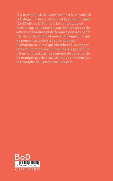 "La Revanche de la Comtesse" est le ce volet de la trilogie : "Un cri à Dieu" et la suite du roman "Le Medic et la Nonne". Le contenu de ce roman touche le côté obscur des pensées et des actions d'hommes et de femmes poussés par la bêtise, la cupidité, la haine et la vengeance qui ne peuvent pas résister et s'y adonner littéralement. Ceux qui cherchent à se venger ouvrent leurs propres blessures. Ils guériraient s'il ne le faisait pas. Le contenu de cette partie ne manque pas de cruauté, mais se termine par le triomphe de l'amour sur la haine.