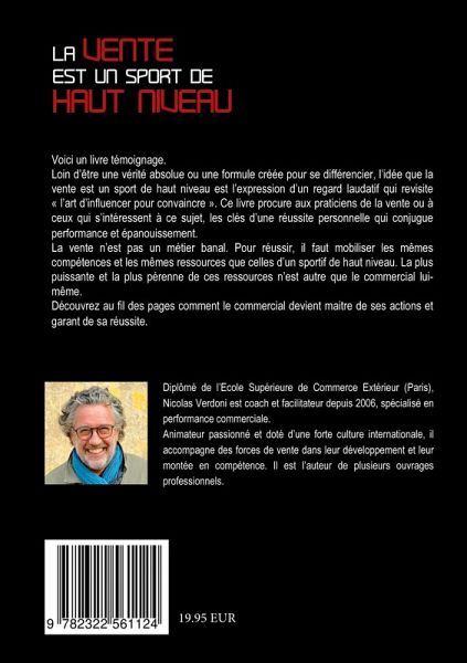 Voici un livre témoignage. Loin d'être une vérité absolue ou une formule créée pour se différencier, l'idée que la vente est un sport de haut niveau est l'expression d'un regard laudatif qui revisite "l'art d'influencer pour convaincre". Ce livre procure aux praticiens de la vente ou à ceux qui s'intéressent à ce sujet, les clés d'une réussite personnelle qui conjugue performance et épanouissement. La vente n'est pas un métier banal. Pour réussir il faut mobiliser les mêmes compétences et le mêmes ressources que celles d'un sportif de haut niveau. La plus puissante et la plus pérenne de ces ressources n'est autre que le commercial lui-même. Découvrez au fil des pages comment le commercial devient maître de ses actions et garant de sa réussite.