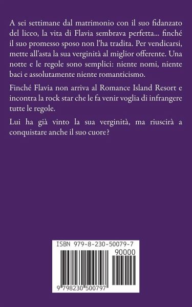 A sei settimane dal matrimonio con il suo fidanzato del liceo, la vita di Flavia sembrava perfetta... finché il suo promesso sposo non l'ha tradita. Per vendicarsi, mette all'asta la sua verginità al miglior offerente. Una notte e le regole sono semplici: niente nomi, niente baci e assolutamente niente romanticismo. Finché Flavia non arriva al Romance Island Resort e incontra la rock star che le fa venir voglia di infrangere tutte le regole. Lui ha già vinto la sua verginità, ma riuscirà a conquistare anche il suo cuore?