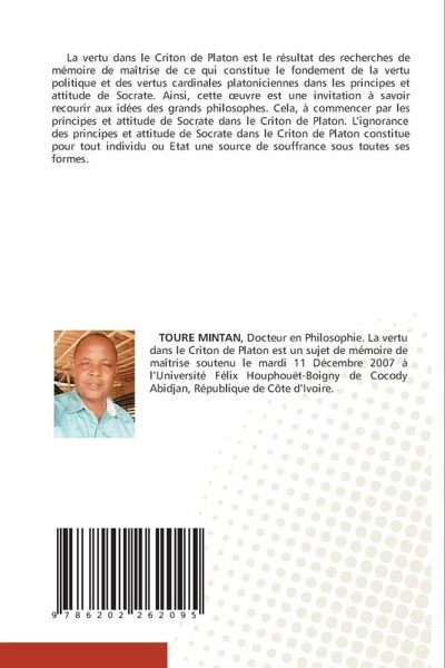 La vertu dans le Criton de Platon est le résultat des recherches de mémoire de maîtrise de ce qui constitue le fondement de la vertu politique et des vertus cardinales platoniciennes dans les principes et attitude de Socrate. Ainsi, cette oeuvre est une invitation à savoir recourir aux idées des grands philosophes. Cela, à commencer par les principes et attitude de Socrate dans le Criton de Platon. L'ignorance des principes et attitude de Socrate dans le Criton de Platon constitue pour tout individu ou Etat une source de souffrance sous toutes ses formes.