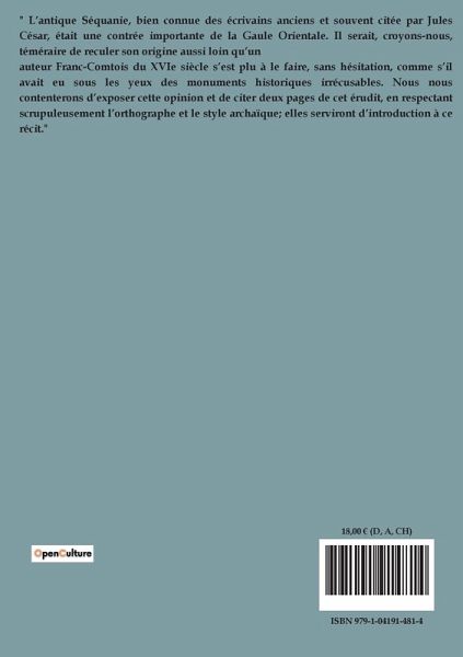 " L¿antique Séquanie, bien connue des écrivains anciens et souvent citée par Jules César, était une contrée importante de la Gaule Orientale. Il serait, croyons-nous, téméraire de reculer son origine aussi loin qüun auteur Franc-Comtois du XVIe siècle s¿est plu à le faire, sans hésitation, comme s¿il avait eu sous les yeux des monuments historiques irrécusables. Nous nous contenterons d¿exposer cette opinion et de citer deux pages de cet érudit, en respectant scrupuleusement l¿orthographe et le style archaïque; elles serviront d¿introduction à ce récit."