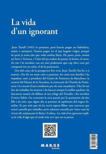 Joan Turull (1945) és pastisser, però hauria pogut ser futbolista, músic o antiquari. Hauria pogut ser el que hagués volgut, perquè de petit ja tenia clar que volia arribar lluny. Els pares, però, tenien un forn a Terrassa, i l'olor del pa acabat de pastar, la farina, el sucre, els ous i la xocolata van ser més poderosos que cap altra cosa per conquerir tot un món, el de la pastisseria. Des dels anys de la postguerra fins avui, Joan Turull s'ha fet a si mateix: s'ha fet un nom com a pastisser, ha creat una família i ha impulsat, com a president del Gremi de Pastissers de Barcelona, la creació del Museu de la Xocolata, la renovació de l'Escola de Pastisseria i la creació d'una residència per als seus estudiants. S'ha fet un fart de treballar, ha innovat i ha buscat sempre la millor qualitat, ha descansat només els dilluns al seu refugi del Penedès, s'ha envoltat d'amics fidels i ha transmès la seva passió per la pastisseria als dos fills i als néts, que algun dia es posaran al capdavant del negoci familiar. És per això que els ha escrit aquest llibre: una conversa que conté consells per treballar, però sobretot consells per viure com ha viscut ell, mitjançant la lluita i l'esforç. La vida d'un ignorant explica la vida d'algú que és molt més savi que no es pensa.