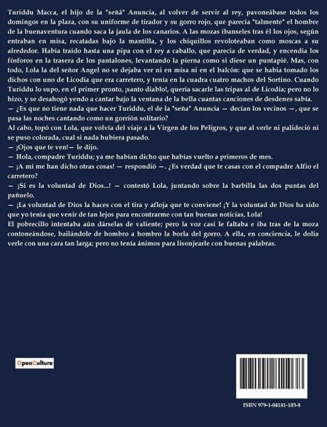 Turiddu Macca, el hijo de la "señá" Anuncia, al volver de servir al rey, pavoneábase todos los domingos en la plaza, con su uniforme de tirador y su gorro rojo, que parecía "talmente" el hombre de la buenaventura cuando saca la jaula de los canarios. A las mozas íbanseles tras él los ojos, según entraban en misa, recatadas bajo la mantilla, y los chiquillos revoloteaban como moscas a su alrededor. Había traído hasta una pipa con el rey a caballo, que parecía de verdad, y encendía los fósforos en la trasera de los pantalones, levantando la pierna como si diese un puntapié. Mas, con todo, Lola la del señor Angel no se dejaba ver ni en misa ni en el balcón: que se había tomado los dichos con uno de Licodia que era carretero, y tenía en la cuadra cuatro machos del Sortino. Cuando Turiddu lo supo, en el primer pronto, ¡santo diablo!, quería sacarle las tripas al de Licodia; pero no lo hizo, y se desahogó yendo a cantar bajo la ventana de la bella cuantas canciones de desdenes sabía. ¿ ¿Es que no tiene nada que hacer Turiddu, el de la "seña" Anuncia ¿ decían los vecinos ¿, que se pasa las noches cantando como un gorrión solitario? Al cabo, topó con Lola, que volvía del viaje a la Virgen de los Peligros, y que al verle ni palideció ni se puso colorada, cual si nada hubiera pasado. ¿ ¡Ojos que te ven!¿ le dijo. ¿ Hola, compadre Turiddu; ya me habían dicho que habías vuelto a primeros de mes. ¿ ¡A mí me han dicho otras cosas! ¿ respondió ¿. ¿Es verdad que te casas con el compadre Alfio el carretero? ¿ ¡Si es la voluntad de Dios...! ¿ contestó Lola, juntando sobre la barbilla las dos puntas del pañuelo. ¿ ¡La voluntad de Dios la haces con el tira y afloja que te conviene! ¡Y la voluntad de Dios ha sido que yo tenía que venir de tan lejos para encontrarme con tan buenas noticias, Lola! El pobrecillo intentaba aún dárselas de valiente; pero la voz casi le faltaba e iba tras de la moza contoneándose, bailándole de hombro a hombro la borla del gorro. A ella, en conciencia, le dolía verle con una cara tan larga; pero no tenía ánimos para lisonjearle con buenas palabras.