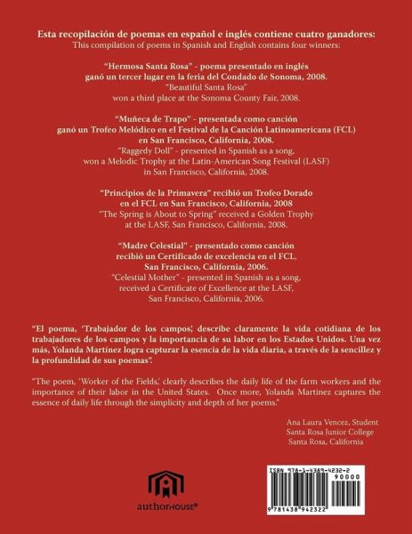 Una vez más, Yolanda Martínez logra capturar la esencia de la vida diaria a través de la sencillez y la profundidad de sus poemas. Por ejemplo, el poema, "Trabajador de los campos", describe claramente la vida cotidiana y la importante labor de los trabajadores de los campos en los Estados Unidos. Además, este libro contiene algunas obras ganadoras de alagadores reconocimientos. Once again, Yolanda Martinez captures the essence of daily life through the simplicity and depth of her poems. For example, "Worker of the Fields" clearly describes the daily life, as well as the value of the farm workers' labor in the Unites States. In addition, this book contains some winning poems with high recognitions.