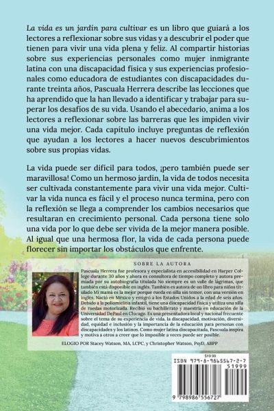 La vida es un jardín para cultivar es un libro que guiará a los lectores a reflexionar sobre sus vidas y a descubrir el poder que tienen para vivir una vida plena y feliz. Al compartir historias sobre sus experiencias personales como mujer inmigrante latina con una discapacidad física y sus experiencias profesionales como educadora de estudiantes con discapacidades durante treinta años, Pascuala Herrera describe las lecciones que ha aprendido que la han llevado a identificar y trabajar para superar los desafíos de su vida. Usando el abecedario, anima a los lectores a reflexionar sobre las barreras que les impiden vivir una vida mejor. Cada capítulo incluye preguntas de reflexión que ayudan a los lectores a hacer nuevos descubrimientos sobre sus propias vidas. La vida puede ser difícil para todos, ¡pero también puede ser maravillosa! Como un hermoso jardín, la vida de todos necesita ser cultivada constantemente para vivir una vida mejor. Cultivar la vida nunca es fácil y el proceso nunca termina, pero con la reflexión se llega a comprender los cambios necesarios que resultaran en crecimiento personal. Cada persona tiene solo una vida por lo que debe ser vivida de la mejor manera posible. Al igual que una hermosa flor, la vida de cada persona puede florecer sin importar los obstáculos que enfrente.