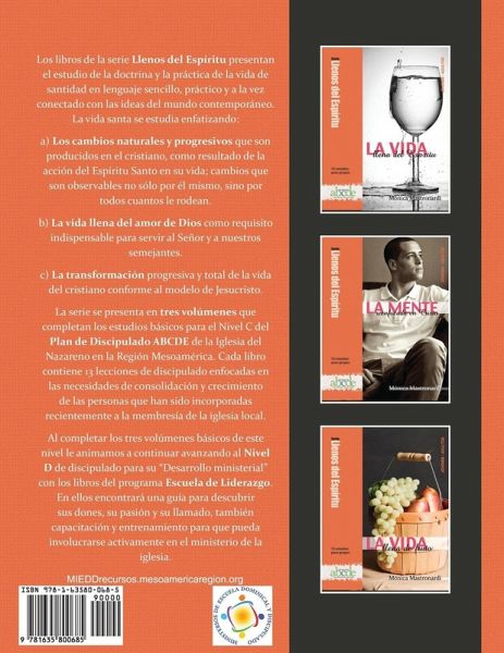 La vida del cristiano es un caminar continuo en el proceso de discipulado, en el cual nuestro ser entero es moldeado conforme al carácter de Jesucristo por el Espíritu Santo. Todos los que hemos "nacido de nuevo" necesitamos participar de este proceso de formación para que podamos llegar a ser cristianos maduros y santos en todas las áreas de nuestra vida. Este volumen que lleva por título: La Vida Llena del Espíritu y es el premer de una serie de tres volúmenes que completan los estudios básicos para el nivel C del plan de Discipulado ABCDE de la Iglesia del Nazareno en la Región Mesoamérica. La serie lleva por nombre: Llenos del Espíritu y abarca 9 meses de estudios. Cada libro contiene 13 lecciones de discipulado enfocadas en las necesidades de consolidación y crecimiento de las personas que han sido incorporadas recientemente a la membresía de la iglesia local. Estas lecciones se han escrito pensando en el maestro discipulador y en la forma en que él o ella debe instruir al grupo de nuevos miembros, a fin de que la enseñanza sea interesante, dinámica y aplicable a sus vidas. Estos libros presentan la doctrina y la práctica de la vida de santidad en un lenguaje sencillo, práctico y a la vez conectado con las ideas del mundo contemporáneo. La vida santa se estudia enfatizando: a. Los cambios naturales y progresivos que son producidos en el cristiano, como resultado de la acción del Espíritu Santo en su vida; cambios que son observables no sólo por él mismo, sino por todos cuantos le rodean. b. La vida llena del amor de Dios como requisito indispensable para servir al Señor y a nuestros semejantes. c. La transformación progresiva y total de la vida del cristiano conforme al modelo de Jesucristo. Cada lección presenta una nueva oportunidad para que Dios continúe obrando y transformando la mente, los afectos y el estilo de vida del discípulo de Cristo, por medio del estudio de la enseñanza bíblica, ejemplos e ilustraciones, ejercicios de auto evaluación, reflexión, toma de decisiones y el establecimiento de nuevas metas para el crecimiento espiritual.