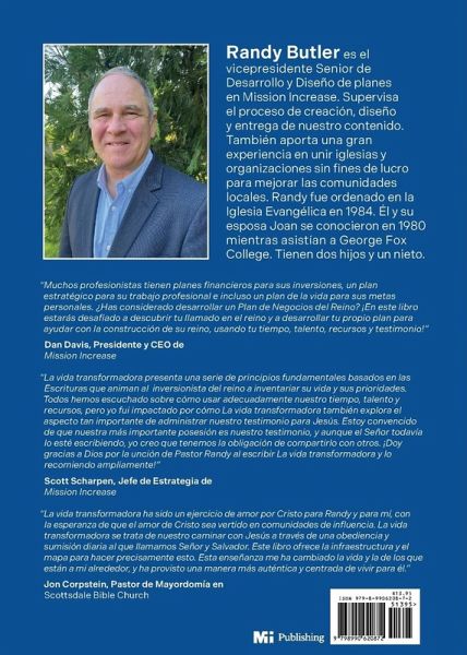¿Cómo querría Dios que vivamos en relación con nuestro tiempo, talentos, testimonio y tesoro? ¿Deberían los cristianos trabajar simplemente para aumentar la cantidad de cosas que poseemos, o tiene Dios un propósito superior-un propósito del Reino-para nuestras finanzas? ¿Y para nuestras vidas? Vida Transformadora: Descubre Tu Asignación del Reino es el resultado de muchos años de estudio, reflexión e implementación por el Dr. Randy R. Butler. Pastor durante muchos años, estudiante de la Biblia e historiador, Butler aporta una gran cantidad de conocimientos sobre por qué Dios ha creado a las personas con habilidades específicas, esferas de influencia y responsabilidades de mayordomía. Escrito a un nivel accesible para el público general, pero con profundidad para los más estudiosos, Vida Transformadora ayudará a cualquier cristiano a crecer en su conocimiento de Dios, y especialmente a aquellos interesados en cómo Dios puede utilizar sus posesiones. Vida Transformadora no te hará sentir culpable por lo que tienes; te hará sentir mejor al permitir que Dios esté al mando de ello. Al ayudar a los lectores a comprender su Asignación del Reino, Butler revela los principios religiosos a menudo pasados por alto en la vida de cinco famosos industriales: Andrew Carnegie, Henry Ford, J.P. Morgan, John D. Rockefeller, Sr., y Cornelius Vanderbilt. Luego muestra cómo los cristianos de hoy, quienes quizás nunca tengan acceso a la cantidad de capital de estos hombres famosos, aún pueden honrar a Dios y ayudar a otros mediante el uso de sus posesiones para los propósitos del Reino de Dios.