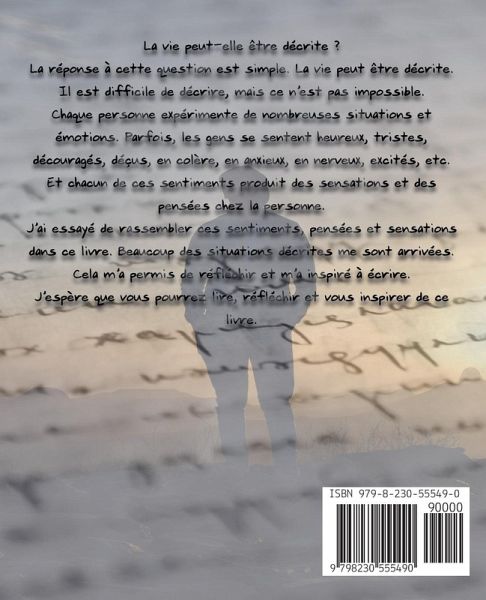 La vie peut-elle être décrite ? La réponse à cette question est simple. La vie peut être décrite. Il est difficile de décrire, mais ce n'est pas impossible. Chaque personne expérimente de nombreuses situations et émotions. Parfois, les gens se sentent heureux, tristes, découragés, déçus, en colère, en anxieux, en nerveux, excités, etc. Et chacun de ces sentiments produit des sensations et des pensées chez la personne. J'ai essayé de rassembler ces sentiments, pensées et sensations dans ce livre. Beaucoup des situations décrites me sont arrivées. Cela m'a permis de réfléchir et m'a inspiré à écrire. J'espère que vous pourrez lire, réfléchir et vous inspirer de ce livre.