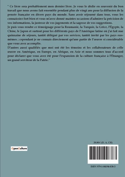 " Ce livre sera probablement mon dernier livre. Je vous le dédie en souvenir du bon travail que nous avons fait ensemble pendant plus de vingt ans pour la diffusion de la pensée française en divers pays du monde. Sans avoir séjourné dans tous, vous les connaissiez fort bien et vous m'avez donné maintes occasions d'admirer la précision de vos informations, la justesse de vos jugements et la sagesse de vos suggestions. Je puis vous rendre ce témoignage pour la Roumanie, la Turquie, la Grèce, l'Égypte, la Chine, le Japon et surtout pour les différents pays de l'Amérique latine où j'ai fait nue quinzaine de séjours, tantôt délégué par vos services, tantôt invité par les pays eux- mêmes ; cependant je ne connais directement qu'une partie de l¿¿uvre si considérable que vous avez accomplie. D'autres aussi qualifiés que moi ont été les témoins et les collaborateurs de celle ¿uvre en Amérique, en Europe, en Afrique, en Asie et nous sommes tous d'accord pour déclarer que vous avez été pour l'expansion de la culture française à l'Étranger, un grand serviteur de la Patrie."