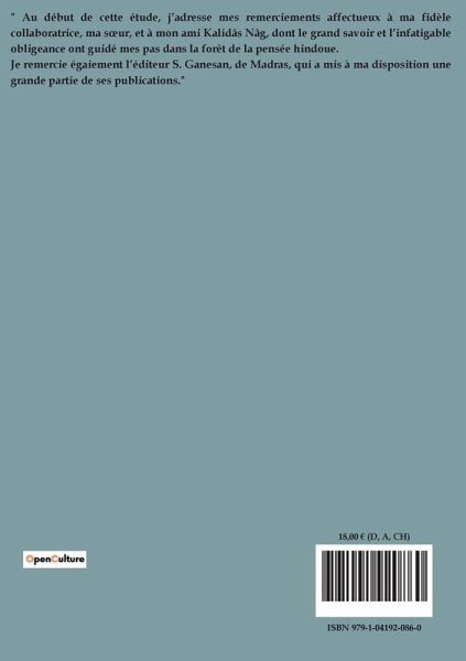 " Au début de cette étude, j¿adresse mes remerciements affectueux à ma fidèle collaboratrice, ma s¿ur, et à mon ami Kalidâs Nâg, dont le grand savoir et l¿infatigable obligeance ont guidé mes pas dans la forêt de la pensée hindoue. Je remercie égaiement l¿éditeur S. Ganesan, de Madras, qui a mis à ma disposition une grande partie de ses publications."
