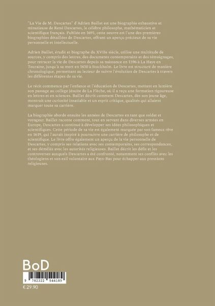 "La Vie de M. Descartes" d'Adrien Baillet est une biographie exhaustive et minutieuse de René Descartes, le célèbre philosophe, mathématicien et scientifique français. Publiée en 1691, cette oeuvre est l'une des premières biographies détaillées de Descartes, offrant un aperçu précieux de sa vie personnelle et intellectuelle.Adrien Baillet, érudit et biographe du XVIIe siècle, utilise une multitude de sources, y compris des lettres, des documents contemporains et des témoignages, pour retracer la vie de Descartes depuis sa naissance en 1596 à La Haye en Touraine, jusqu'à sa mort en 1650 à Stockholm. Le livre est structuré de manière chronologique, permettant au lecteur de suivre l'évolution de Descartes à travers les différentes étapes de sa vie.Le récit commence par l'enfance et l'éducation de Descartes, mettant en lumière son passage au collège jésuite de La Flèche, où il a reçu une formation rigoureuse en lettres et en sciences. Baillet décrit comment Descartes, dès son jeune âge, montrait une curiosité insatiable et un esprit critique, qualités qui allaient marquer toute sa carrière.La biographie aborde ensuite les années de Descartes en tant que soldat et voyageur. Baillet raconte comment, tout en servant dans diverses armées en Europe, Descartes a continué à développer ses idées philosophiques et scientifiques. Cette période de sa vie est également marquée par son fameux rêve en 1619, qui l'aurait inspiré à poursuivre une carrière de philosophe et de scientifique.Baillet consacre une grande partie de son ouvrage à l'analyse des oeuvres majeures de Descartes, notamment "Le Discours de la méthode", "Les Méditations métaphysiques" et "Les Principes de la philosophie". Il explique les circonstances de leur rédaction, leur réception par le public et leur impact sur la pensée scientifique et philosophique de l'époque. Baillet ne se contente pas de résumer ces oeuvres, mais il en explore également les idées principales et la manière dont elles ont révolutionné la philosophie et les sciences.Le livre offre également un aperçu de la vie personnelle de Descartes, y compris ses relations avec ses contemporains, ses correspondances, et ses démêlés avec les autorités religieuses. Baillet décrit les défis et les controverses auxquels Descartes a été confronté, notamment ses conflits avec les théologiens et son exil volontaire aux Pays-Bas pour échapper aux pressions religieuses.