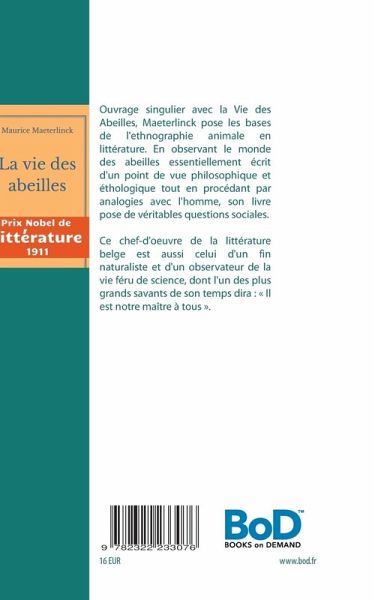 Ouvrage singulier avec la Vie des Abeilles, Maeterlinckpose les bases de l'ethnographie animale en littérature. En observant le monde des abeilles essentiellement écrit d'un point de vue philosophique et éthologique tout en procédant par analogies avec l'homme, son livre pose de véritables questions sociales.