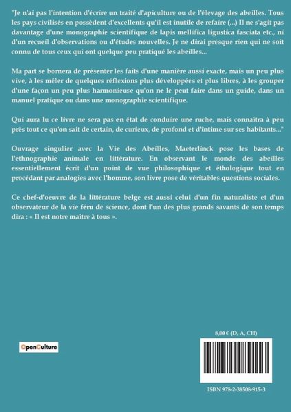 "Je n'ai pas l'intention d'écrire un traité d'apiculture ou de l'élevage des abeilles. Tous les pays civilisés en possèdent d'excellents qu'il est inutile de refaire (...) Il ne s'agit pas davantage d'une monographie scientifique de lapis mellifica ligustica fasciata etc., ni d'un recueil d'observations ou d'études nouvelles. Je ne dirai presque rien qui ne soit connu de tous ceux qui ont quelque peu pratiqué les abeilles... Ma part se bornera de présenter les faits d'une manière aussi exacte, mais un peu plus vive, à les mêler de quelques réflexions plus développées et plus libres, à les grouper d'une façon un peu plus harmonieuse qu'on ne le peut faire dans un guide, dans un manuel pratique ou dans une monographie scientifique. Qui aura lu ce livre ne sera pas en état de conduire une ruche, mais connaîtra à peu près tout ce qu'on sait de certain, de curieux, de profond et d'intime sur ses habitants..." Ouvrage singulier avec la Vie des Abeilles, Maeterlinck pose les bases de l'ethnographie animale en littérature. En observant le monde des abeilles essentiellement écrit d'un point de vue philosophique et éthologique tout en procédant par analogies avec l'homme, son livre pose de véritables questions sociales. Ce chef-d'oeuvre de la littérature belge est aussi celui d'un fin naturaliste et d'un observateur de la vie féru de science, dont l'un des plus grands savants de son temps dira : « Il est notre maître à tous ».