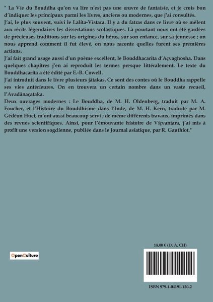 " La Vie du Bouddha qüon va lire n¿est pas une ¿uvre de fantaisie, et je crois bon d¿indiquer les principaux parmi les livres, anciens ou modernes, que j¿ai consultés. J¿ai, le plus souvent, suivi le Lalita-Vistara. Il y a du fatras dans ce livre où se mêlent aux récits légendaires les dissertations scolastiques. Là pourtant nous ont été gardées de précieuses traditions sur les origines du héros, sur son enfance, sur sa jeunesse ; on nous apprend comment il fut élevé, on nous raconte quelles furent ses premières actions. J¿ai fait grand usage aussi d¿un poème excellent, le Bouddhacarita d¿Açvaghosha. Dans quelques chapitres j¿en ai reproduit les termes presque littéralement. Le texte du Bouddhacarita a été édité par E.-B. Cowell. J¿ai introduit dans le livre plusieurs jâtakas. Ce sont des contes où le Bouddha rappelle ses vies antérieures. On en trouvera un certain nombre dans un vaste recueil, l¿Avadânaçataka. Deux ouvrages modernes : Le Bouddha, de M. H. Oldenberg, traduit par M. A. Foucher, et l¿Histoire du Bouddhisme dans l¿Inde, de M. H. Kern, traduite par M. Gédéon Huet, m¿ont aussi beaucoup servi ; de même différents travaux, imprimés dans des revues scientifiques. Ainsi, pour l¿émouvante histoire de Viçvantara, j¿ai mis à profit une version sogdienne, publiée dans le Journal asiatique, par R. Gauthiot."