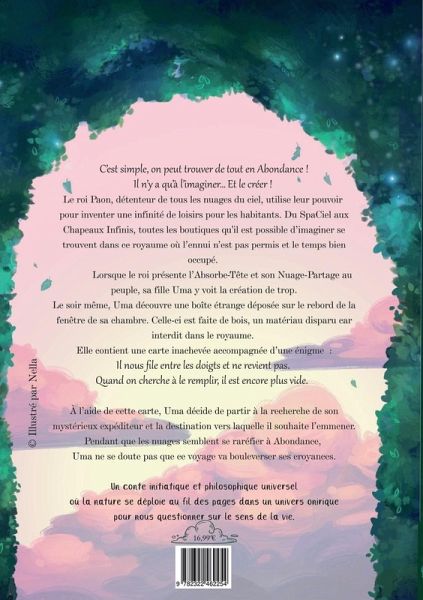 " C'est simple, on peut trouver de tout en Abondance ! Il n'y a qu'à l'imaginer... Et le créer ! " Le roi Paon, détenteur de tous les nuages du ciel, utilise leur pouvoir pour inventer une infinité de loisirs pour les habitants. Du SpaCiel aux Chapeaux-Infinis, toutes les boutiques qu'il est possible d'imaginer se trouvent dans ce royaume où l'ennui n'est pas permis et le temps bien occupé. Lorsque le roi présente l'Absorbe-Tête et son Nuage-Partage au peuple, sa fille Uma y voit la création de trop. Le soir même, Uma découvre une boîte étrange déposée sur le rebord de la fenêtre de sa chambre. Celle-ci est faite de bois, un matériau disparu car interdit dans le royaume. Elle contient une carte inachevée accompagnée d'une énigme: " Il nous file entre les doigts et ne revient pas. Quand on cherche à le remplir, il est encore plus vide." À l'aide de cette carte, Uma décide de partir à la recherche de son mystérieux expéditeur et la destination vers laquelle il souhaite l'emmener. Pendant que les nuages semblent se raréfier à Abondance, Uma ne se doute pas que ce voyage va bouleverser ses croyances. Un conte initiatique et philosophique universel où la nature se déploie au fil des pages dans un univers onirique pour nous questionner sur le sens de la vie. À partir de 10 ans.