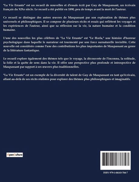 "La Vie Errante" est un recueil de nouvelles et d'essais écrit par Guy de Maupassant, un écrivain français du XIXe siècle. Le recueil a été publié en 1890, peu de temps avant la mort de l'auteur. Ce recueil se distingue des autres ¿uvres de Maupassant par son exploration de thèmes plus universels et philosophiques. Il se compose de plusieurs récits et essais qui reflètent les voyages et les expériences de l'auteur, ainsi que sa réflexion sur la vie, la nature humaine et la condition humaine. L'une des nouvelles les plus célèbres de "La Vie Errante" est "Le Horla," une histoire d'horreur psychologique dans laquelle le narrateur est tourmenté par une force surnaturelle invisible. Cette nouvelle est considérée comme l'une des contributions les plus importantes de Maupassant au genre de la littérature fantastique. Le recueil explore également des thèmes tels que le voyage, la découverte de l'inconnu, la solitude, la folie et la quête de sens dans la vie. Il offre une perspective plus profonde et introspective de Maupassant par rapport à ses ¿uvres plus traditionnelles. "La Vie Errante" est un exemple de la diversité de talent de Guy de Maupassant en tant qu'écrivain, allant au-delà de ses récits réalistes pour explorer des thèmes plus philosophiques et imaginatifs.