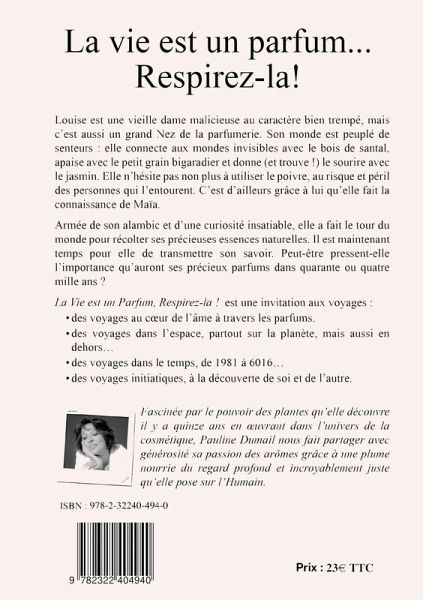 "Fascinée par le pouvoir des plantes qu'elle découvre il y a vingt ans en oeuvrant dans l'univers de la cosmétiques, puis de l'aromathérapie, enfin de l'olfactothérapie, Pauline Dumail nous fait partager avec générosité sa passion des arômes grâce à une plume nourrie du regard profond et incroyablement juste qu'elle pose sur l'Humain. Dans son cheminement, elle est allée à la rencontre de différents experts sur les sujets qui la touchaient, nous restituant dans "La Vie est un Parfum, Respirez-la !", ces connaissances, dans une écriture à la fois émotionnelle et rationnelle. Subtile, drôle et touchante, cette histoire vous emmènera dans des univers très différents, mais tous parfumés ! ' Marie-Laure Prou