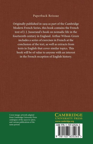 Originally published in 1919 as part of the Cambridge Modern French Series, this book contains the French text of J. J. Jusserand's book on nomadic life in the fourteenth century in England. Arthur Wilson-Green includes a series of exercises in French at the conclusion of the text, as well as extracts from texts in English that cover similar topics. This book will be of value to anyone with an interest in the French reception of English history.