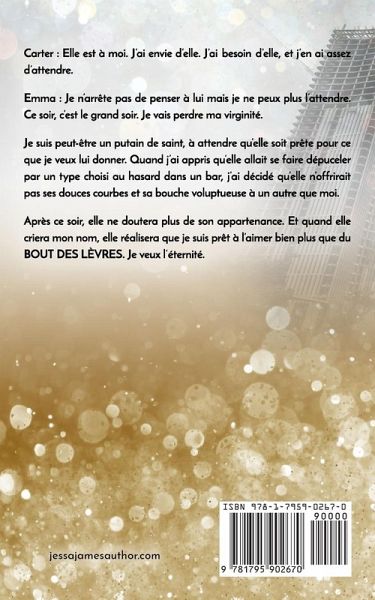 Carter : Elle est à moi. J'ai envie d'elle. J'ai besoin d'elle, et j'en ai assez d'attendre. Emma : Je n'arrête pas de penser à lui mais je ne peux plus l'attendre. Ce soir, c'est le grand soir. Je vais perdre ma virginité. Je suis peut-être un putain de saint, à attendre qu'elle soit prête pour ce que je veux lui donner. Quand j'ai appris qu'elle allait se faire dépuceler par un type choisi au hasard dans un bar, j'ai décidé qu'elle n'offrirait pas ses douces courbes et sa bouche voluptueuse à un autre que moi. Après ce soir, elle ne doutera plus de son appartenance. Et quand elle criera mon nom, elle réalisera que je suis prêt à l'aimer bien plus que du BOUT DES LÈVRES. Je veux l'éternité. Du Bout des Lèvres est une histoire complète, qui se lit rapidement, avec une fin heureuse, aucun coup de théâtre à la fin, et AUCUNE tromperie ! Si vous aimez les mauvais garçons qui savent exactement ce qu'ils veulent, les coups de foudre qui vous feront fondre dans votre culotte, et une fin heureuse garantie, ce n'est qu'à un clic!