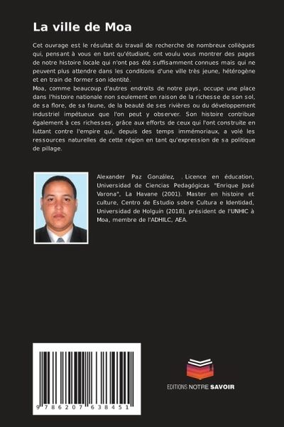 Cet ouvrage est le résultat du travail de recherche de nombreux collègues qui, pensant à vous en tant qu'étudiant, ont voulu vous montrer des pages de notre histoire locale qui n'ont pas été suffisamment connues mais qui ne peuvent plus attendre dans les conditions d'une ville très jeune, hétérogène et en train de former son identité.Moa, comme beaucoup d'autres endroits de notre pays, occupe une place dans l'histoire nationale non seulement en raison de la richesse de son sol, de sa flore, de sa faune, de la beauté de ses rivières ou du développement industriel impétueux que l'on peut y observer. Son histoire contribue également à ces richesses, grâce aux efforts de ceux qui l'ont construite en luttant contre l'empire qui, depuis des temps immémoriaux, a volé les ressources naturelles de cette région en tant qu'expression de sa politique de pillage.