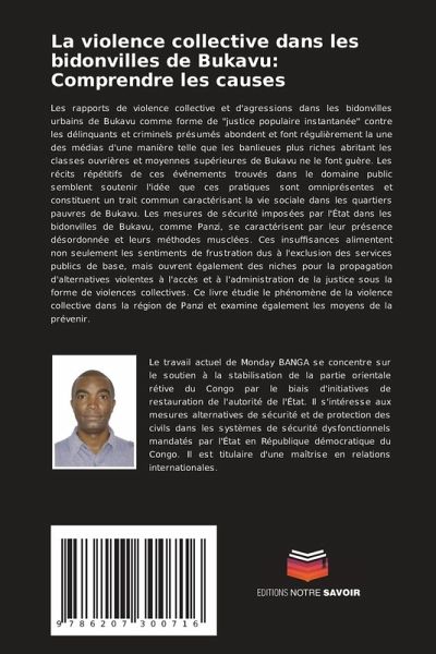 Les rapports de violence collective et d'agressions dans les bidonvilles urbains de Bukavu comme forme de "justice populaire instantanée" contre les délinquants et criminels présumés abondent et font régulièrement la une des médias d'une manière telle que les banlieues plus riches abritant les classes ouvrières et moyennes supérieures de Bukavu ne le font guère. Les récits répétitifs de ces événements trouvés dans le domaine public semblent soutenir l'idée que ces pratiques sont omniprésentes et constituent un trait commun caractérisant la vie sociale dans les quartiers pauvres de Bukavu. Les mesures de sécurité imposées par l'État dans les bidonvilles de Bukavu, comme Panzi, se caractérisent par leur présence désordonnée et leurs méthodes musclées. Ces insuffisances alimentent non seulement les sentiments de frustration dus à l'exclusion des services publics de base, mais ouvrent également des niches pour la propagation d'alternatives violentes à l'accès et à l'administration de la justice sous la forme de violences collectives. Ce livre étudie le phénomène de la violence collective dans la région de Panzi et examine également les moyens de la prévenir.