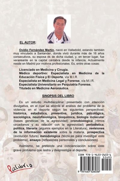Es un estudio multidisciplinar presentado con intención divulgativa en el que se ha procurado, en la medida de lo posible, allanar los imprescindibles tecnicismos correspondientes a las varias materias que se abordan en esta obra, en la que el autor (que entre otras cosas es médico especialista en Medicina Deportiva y también especialista en Medicina Legal y Forense, así como persona con aficiones multidisciplinares) aborda el análisis del nefasto problema de la violencia en el deporte según las siguientes perspectivas: histórica, estadística, preventiva, jurídica, psicológica, sociológica, neurofisiológica, bioquímica, biología molecular (bases genéticas de la agresividad: no confundir agresividad con violencia) cronobiológica (ritmos circadianos y su relación con la agresividad) periodística (tratamiento de los medios de comunicación ¿influyen positiva o negativamente?. También expone algunas crónicas deportivas relacionadas con la violencia en el deporte, a modo de "cronista improvisado"); política, literaria (algunos ejemplos en la Literatura), revisiones de la información existente sobre la materia, prospectiva (evolución futura de la violencia en el deporte) metodología para investigar este problema, ensayo (reflexiones personales y conclusiones). Asimismo, se pretende una concienciación sobre este grave problema que lastra y desprestigia el deporte.