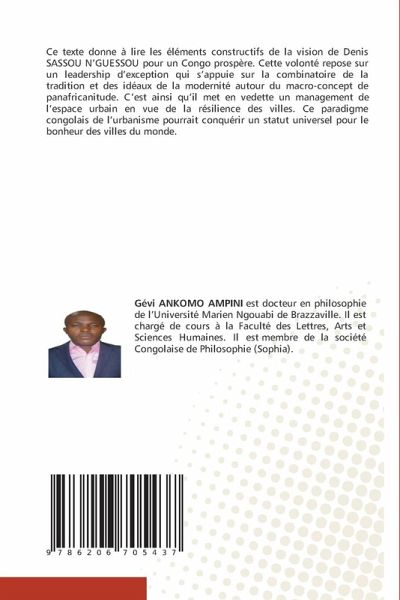 Ce texte donne à lire les éléments constructifs de la vision de Denis SASSOU N'GUESSOU pour un Congo prospère. Cette volonté repose sur un leadership d'exception qui s'appuie sur la combinatoire de la tradition et des idéaux de la modernité autour du macro-concept de panafricanitude. C'est ainsi qu'il met en vedette un management de l'espace urbain en vue de la résilience des villes. Ce paradigme congolais de l'urbanisme pourrait conquérir un statut universel pour le bonheur des villes du monde.