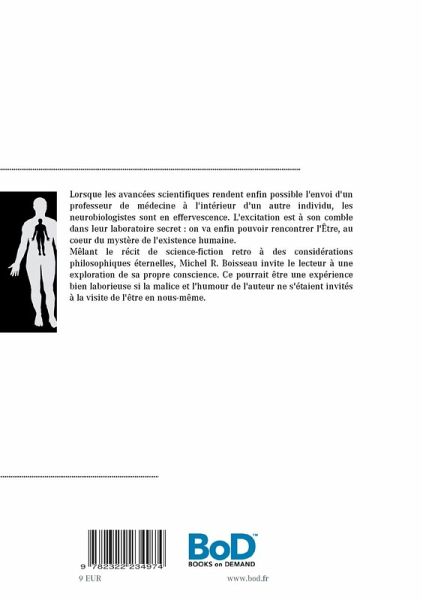 Lorsque les avancees scientifiques rendent enfin possible l'envoi d'un professeur de medecine a l'interieur d'un autre individu, les neurobiologistes sont en effervescence. L'excitation est a son comble dans leur laboratoire secret : on va enfin pouvoir rencontrer l'Etre, au coeur du mystere de l'existence humaine. Melant le recit de science fiction vintage a des considerations philosophiques actuelles, Michel R. Boisseau invite le lecteur a une exploration de sa propre conscience. Ce pourrait etre une experience bien laborieuse si la malice et l'humour de l'auteur ne s'etaient invites a la visite de l'etre en nous-meme.