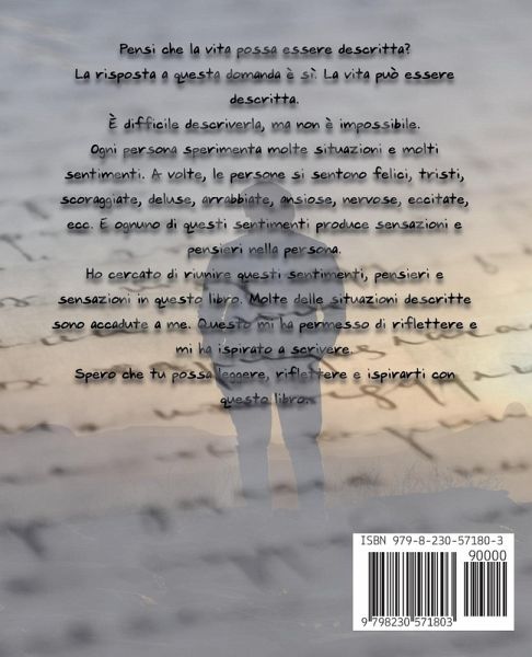 Pensi che la vita possa essere descritta? La risposta a questa domanda è sì. La vita può essere descritta. È difficile descriverla, ma non è impossibile. Ogni persona sperimenta molte situazioni e molti sentimenti. A volte, le persone si sentono felici, tristi, scoraggiate, deluse, arrabbiate, ansiose, nervose, eccitate, ecc. E ognuno di questi sentimenti produce sensazioni e pensieri nella persona. Ho cercato di riunire questi sentimenti, pensieri e sensazioni in questo libro. Molte delle situazioni descritte sono accadute a me. Questo mi ha permesso di riflettere e mi ha ispirato a scrivere. Spero che tu possa leggere, riflettere e ispirarti con questo libro.